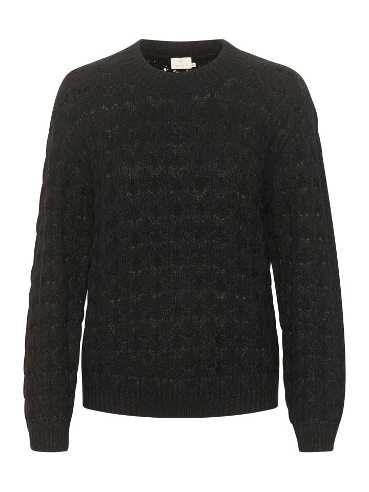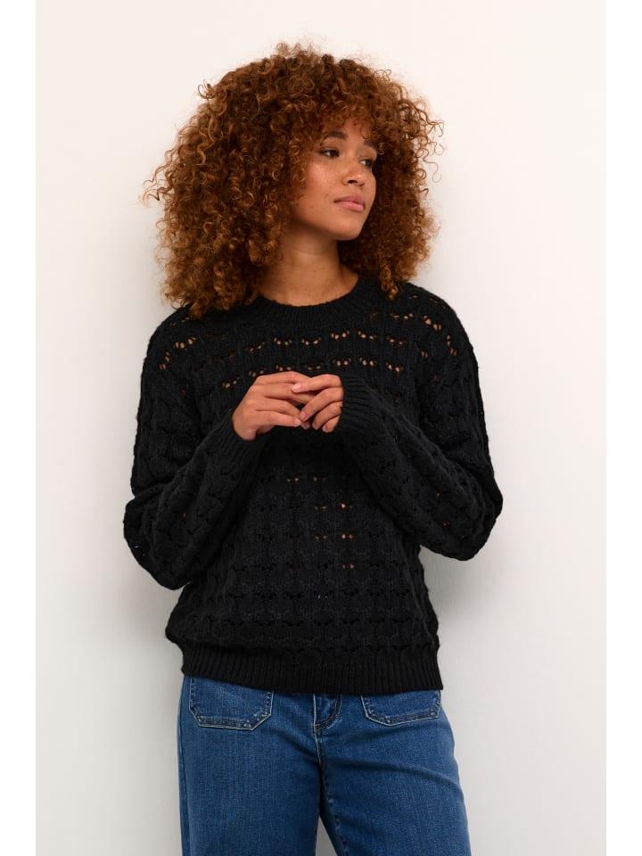 Свитер с ажурным узором, классическим круглым вырезом, прямым кроем и ребристыми манжетами. Воздушный дизайн, стильная подача.