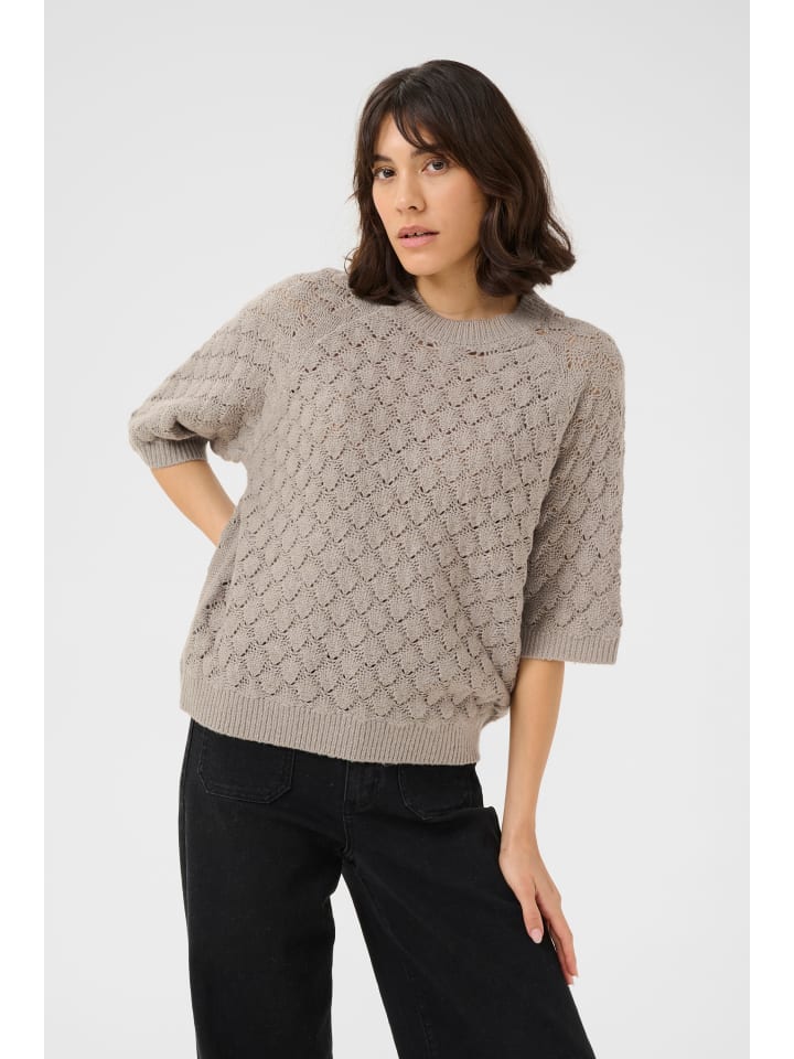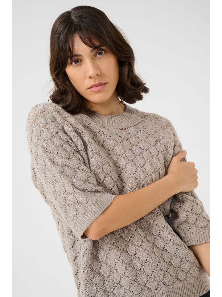 Современный свитер с короткими рукавами, характерной фактурной вязкой и свободным, свободным кроем. Круглый вырез горловины с ребристыми деталями.