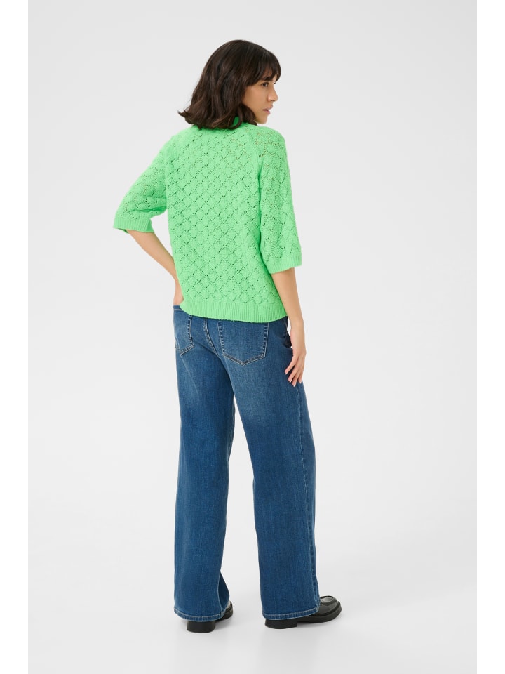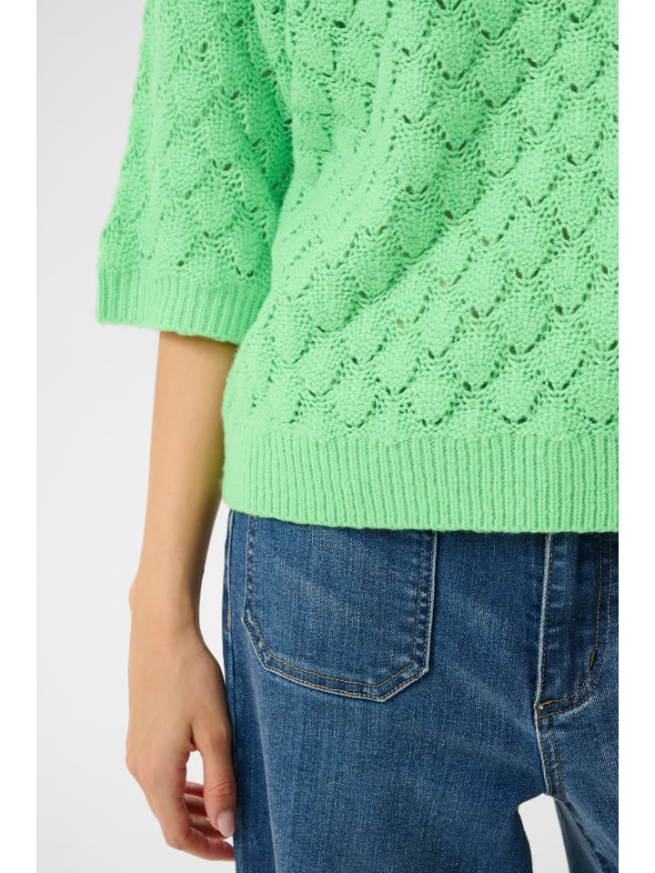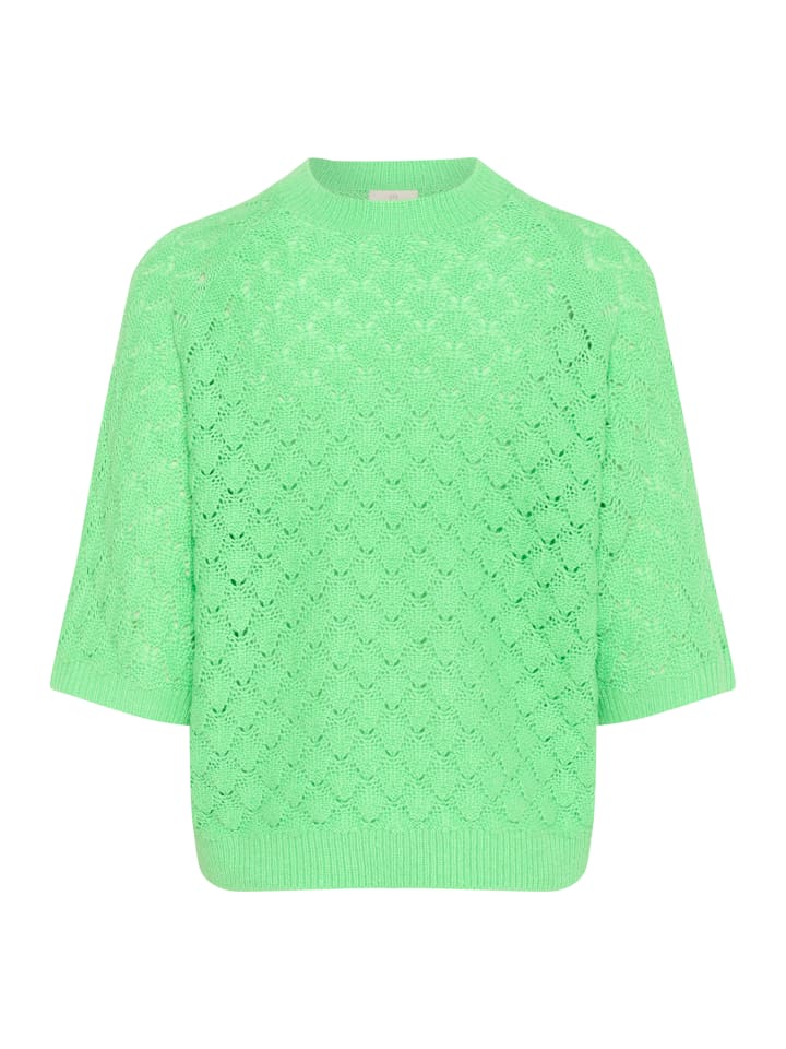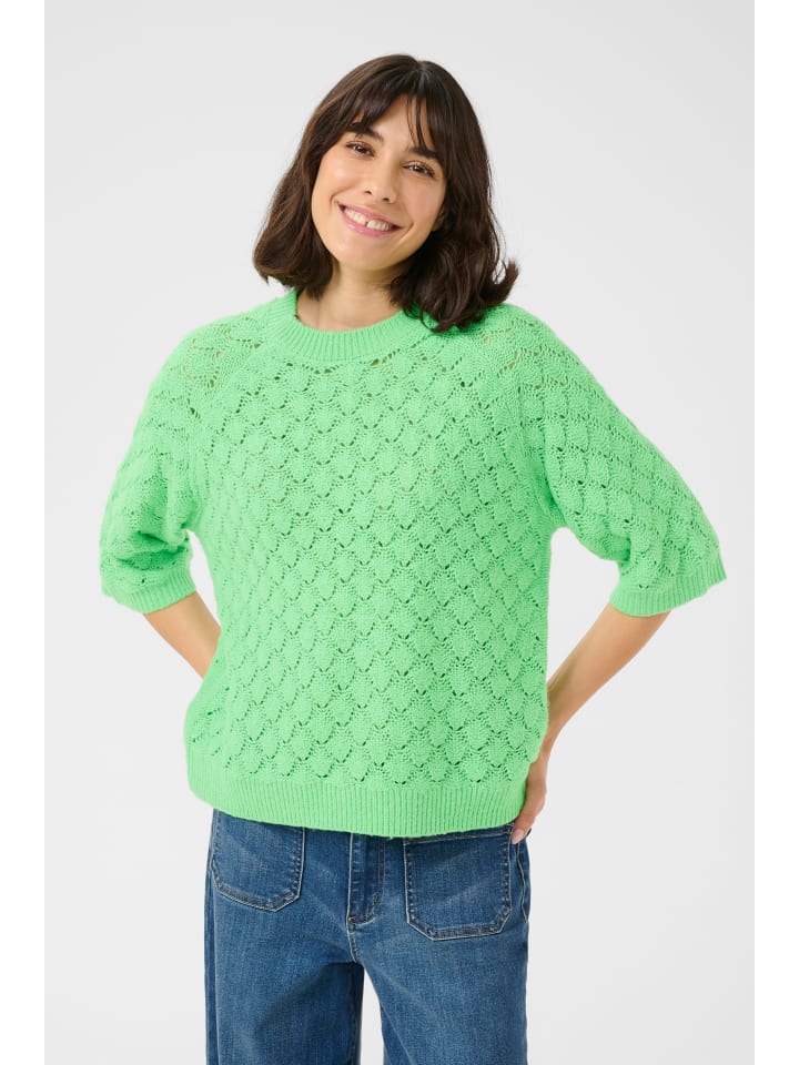 Современный свитер с короткими рукавами, характерной фактурной вязкой и свободным, свободным кроем. Круглый вырез горловины с ребристыми деталями.