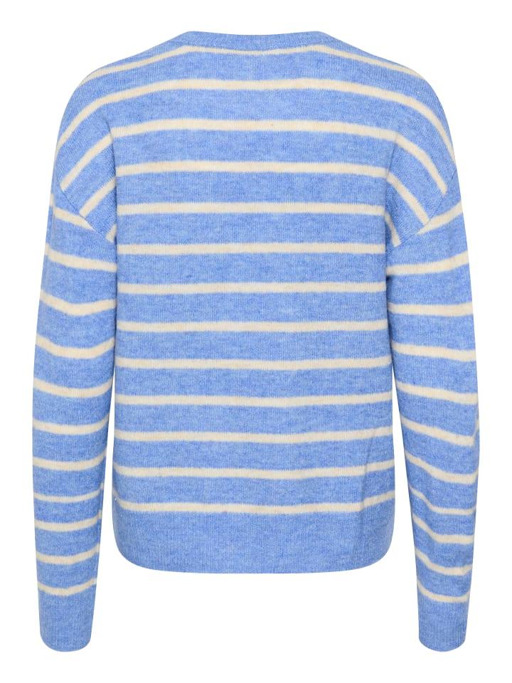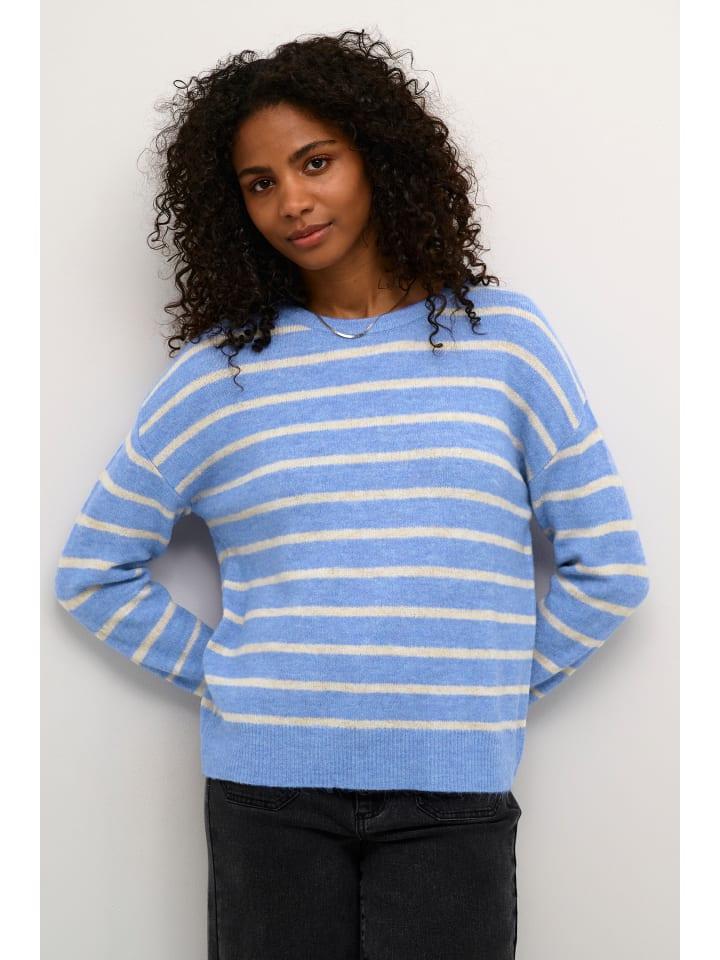 Полосатый свитер с мягким кроем, свободным кроем и спущенными плечами. Круглый вырез и длинные рукава дополняют дизайн.