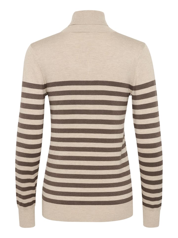 Этот полосатый трикотажный свитер станет незаменимым дополнением к вашему гардеробу. Приталенный крой, длинные рукава и элегантный воротник-стойка придают ему стильный вид. Он легко комбинируется и идеально подходит для создания многослойного образа в прохладные дни, как для повседневной носки, так и для особых случаев.