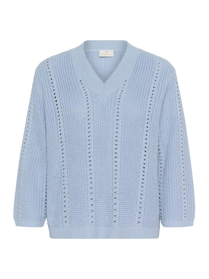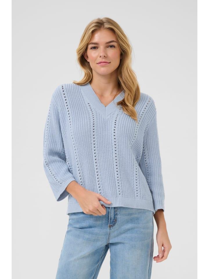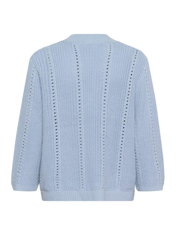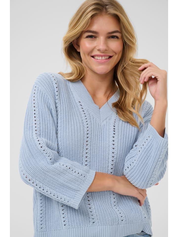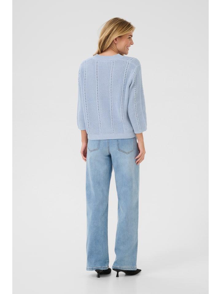 Свитер рубчатой вязки с V-образным вырезом, прямым кроем и укороченными рукавами. Вертикальный ажурный рисунок и фактурная отделка придают изделию современный вид.