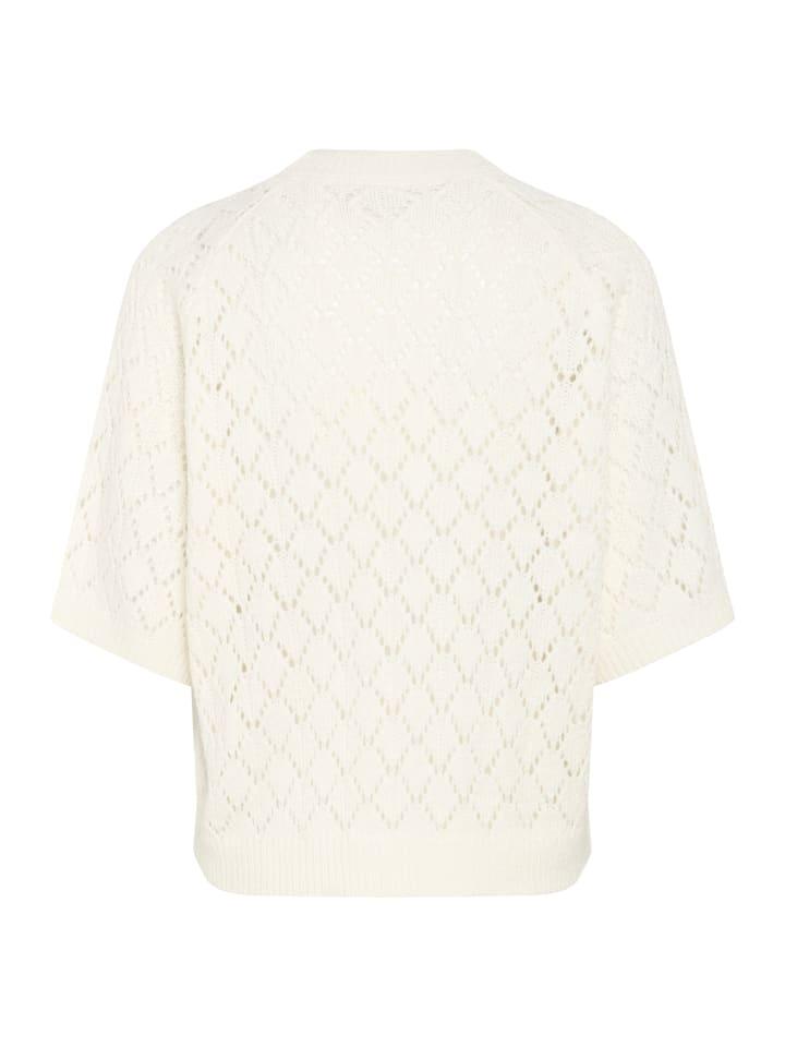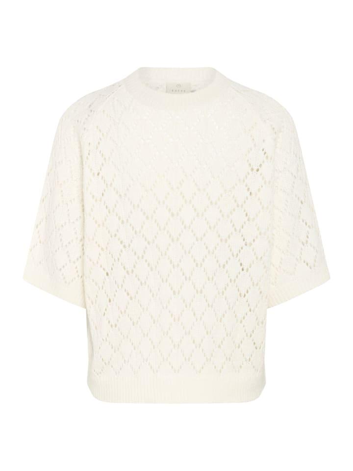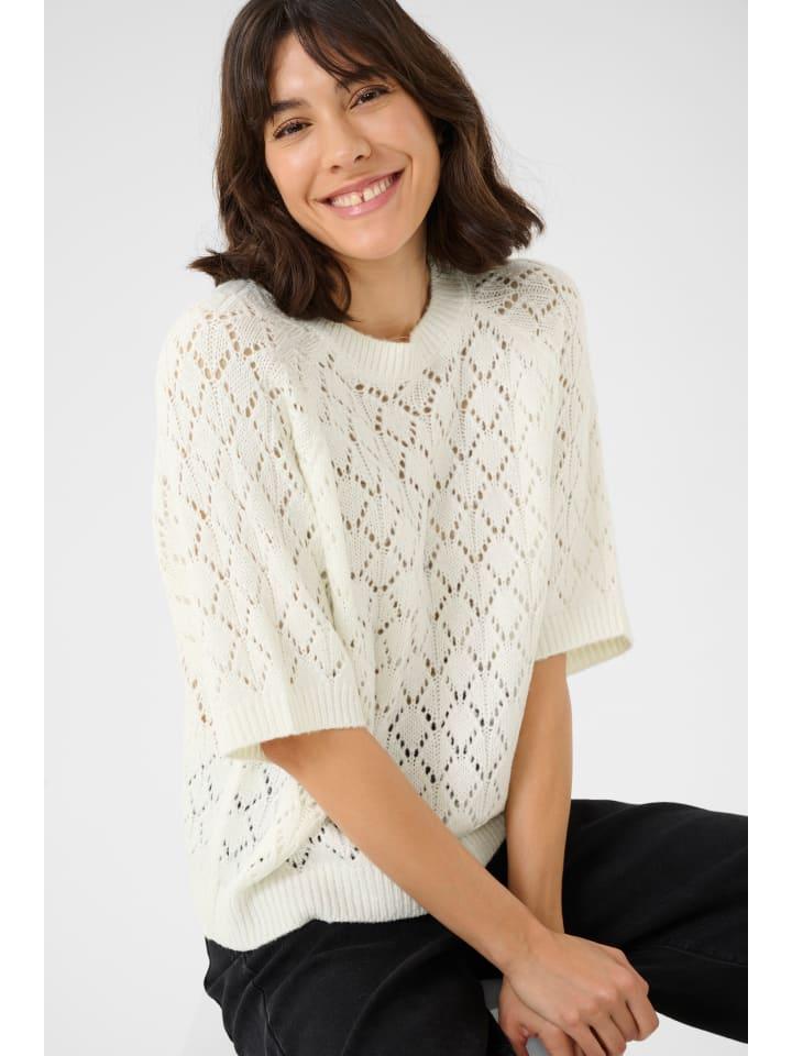 Свитер с короткими рукавами, свободным кроем, узором ажурные ромбы и круглым вырезом. Контрастные детали в рубчик добавляют современный акцент.