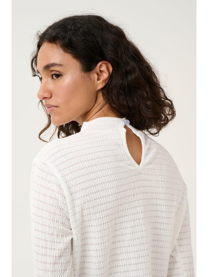 Верх прямого силуэта, воротник-стойка, полупрозрачные горизонтальные полосы и длинные рукава. Современный и лаконичный дизайн.