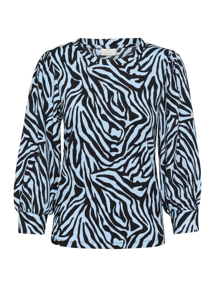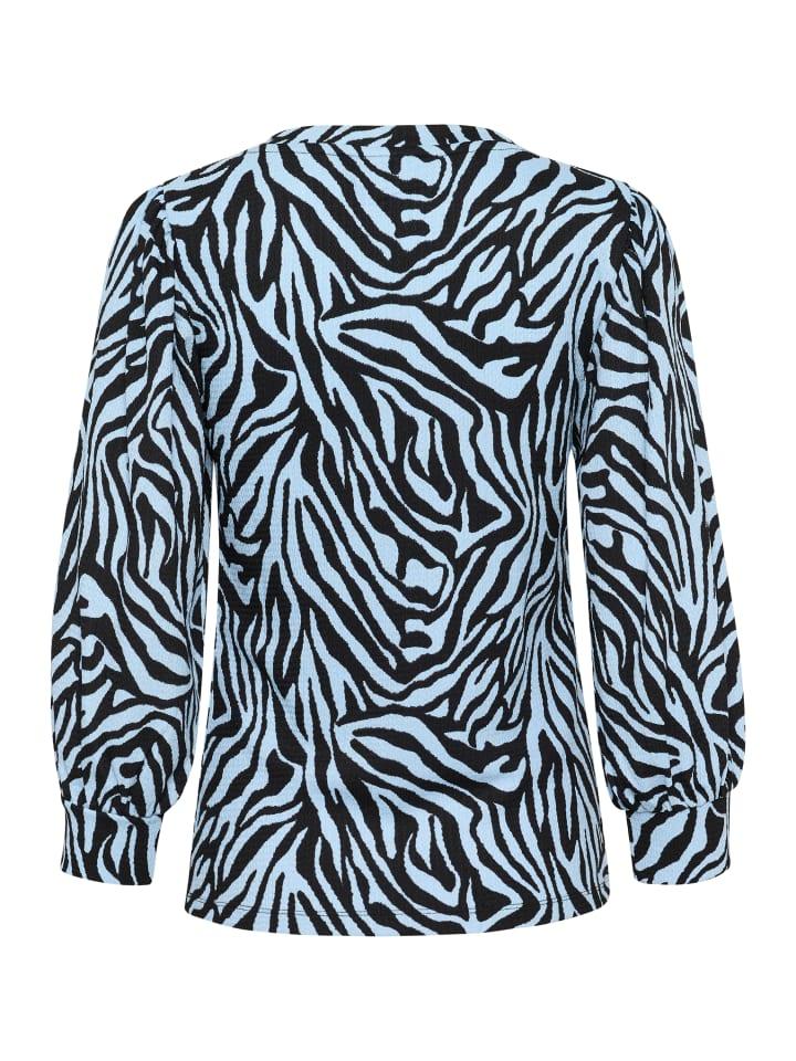 Блузка с принтом зебра прямого кроя, круглым вырезом и длинными рукавами с легкими буфами и манжетами. Эффектный современный вид.
