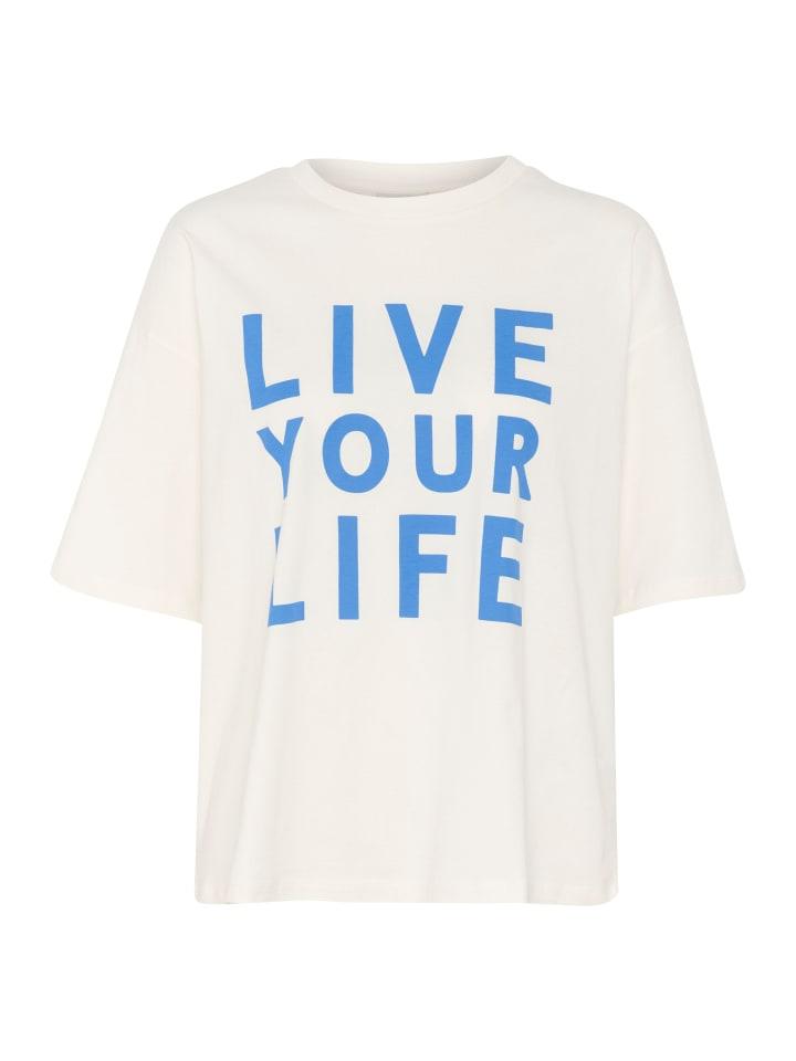 Футболка свободного кроя с эффектным крупным синим принтом спереди, прямым силуэтом, классическим круглым вырезом и короткими широкими рукавами.
