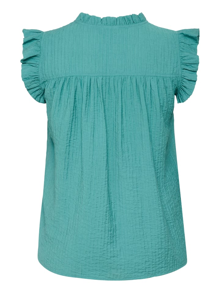 Блузка без рукавов свободного кроя с оборками на рукавах и фактурной тканью. Застежка на половину пуговицы и V-образный вырез обеспечивают современный комфорт и универсальный стиль.