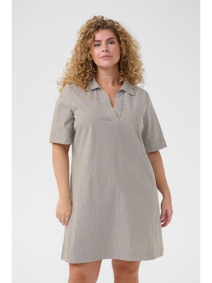Это короткое платье свободного кроя сочетает в себе классические полоски, V-образный вырез с воротником и короткие рукава. Дышащий материал обеспечивает высокий комфорт и универсальность.