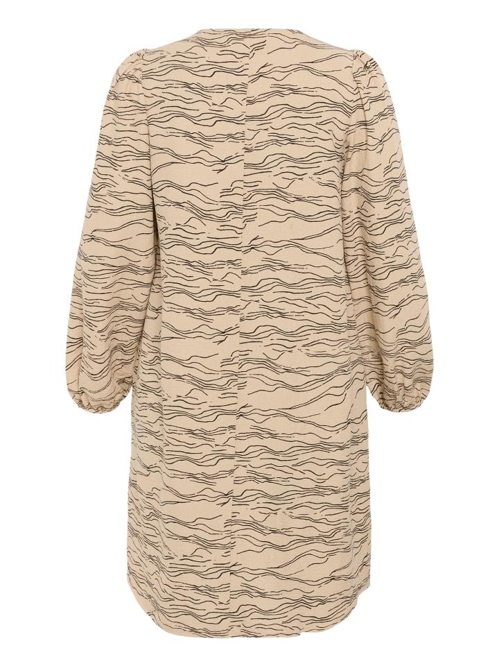 Это платье свободного кроя с V-образным вырезом и длинными рукавами обеспечивает комфортную посадку. Длина до колена и изящные складки подчеркивают женственный силуэт.