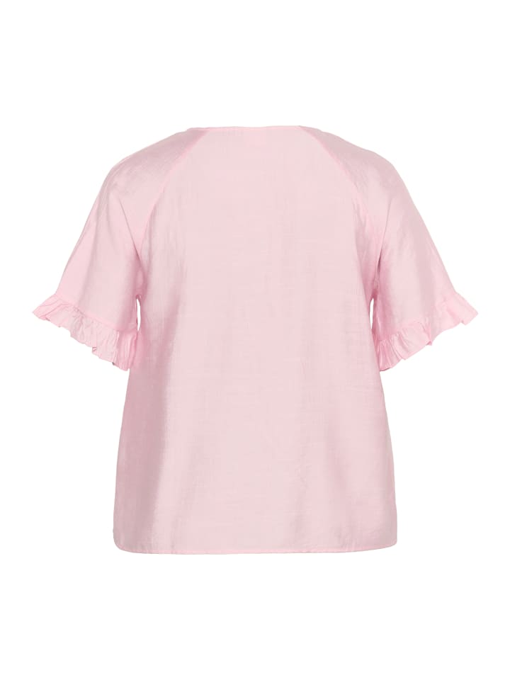 Блузка с V-образным вырезом и оборкой, свободным кроем, короткими рукавами и мягкой тканью. Универсальная модель для повседневной носки и офиса.