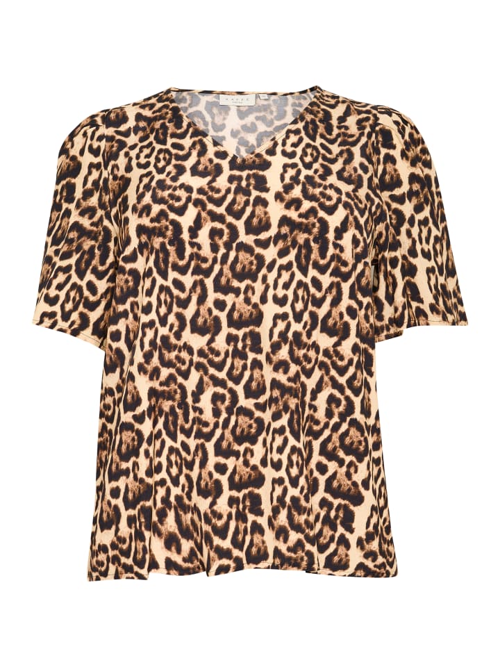 Топ с леопардовым принтом свободного кроя и струящимся силуэтом. V-образный вырез и короткие рукава обеспечивают комфорт и универсальность.