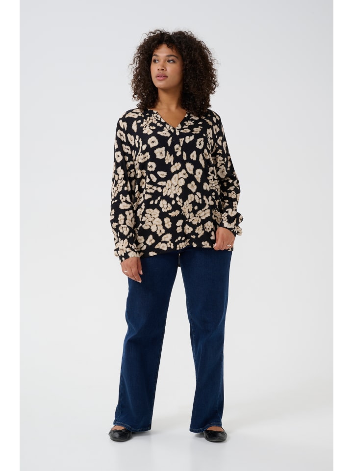 Женская блузка свободного кроя со стильным V-образным вырезом и длинными рукавами для комфортной носки. Универсальная модель для работы и отдыха.