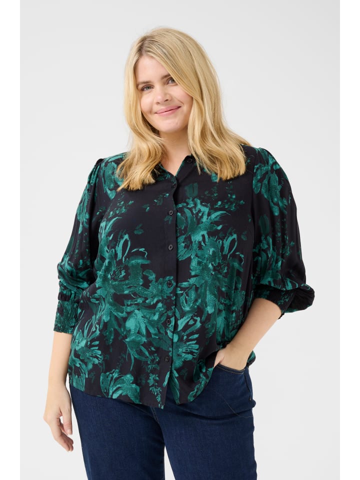 Блузка свободного кроя с классическим рубашечным воротником, застежкой на пуговицы до середины бедра и объемными рукавами обеспечивает максимальный комфорт.