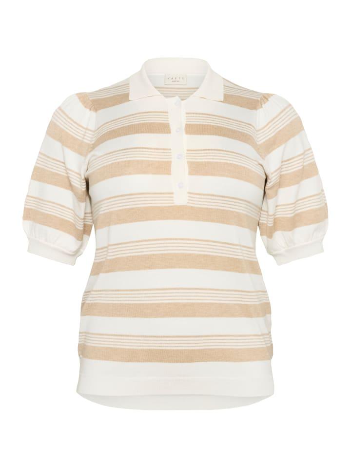Трикотажный топ в полоску с удобным свободным кроем. Воротник-поло, планка на половинках пуговиц и рукава-буфы обеспечивают современный повседневный комфорт.
