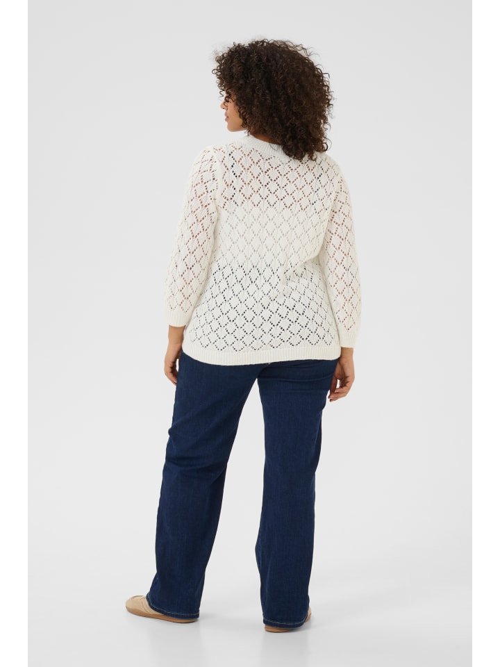 Свободный трикотажный свитер с открытым кружевным узором, классическим круглым вырезом и рукавами длиной 3/4. Универсальные сочетания для комфорта и стиля.