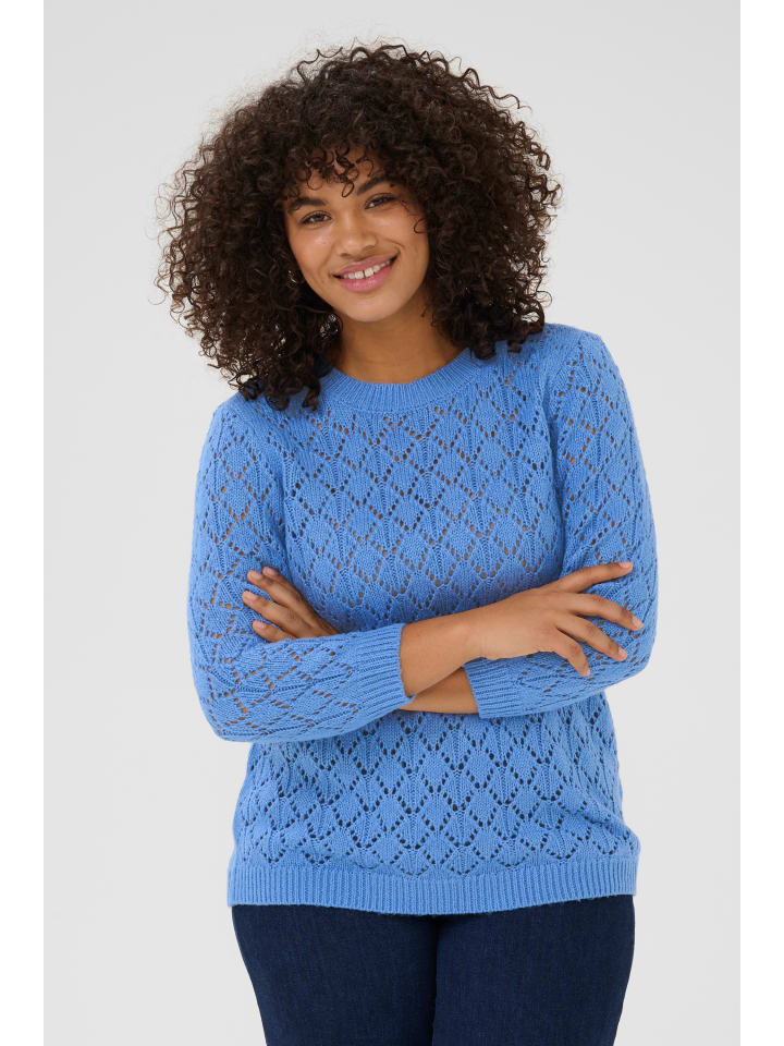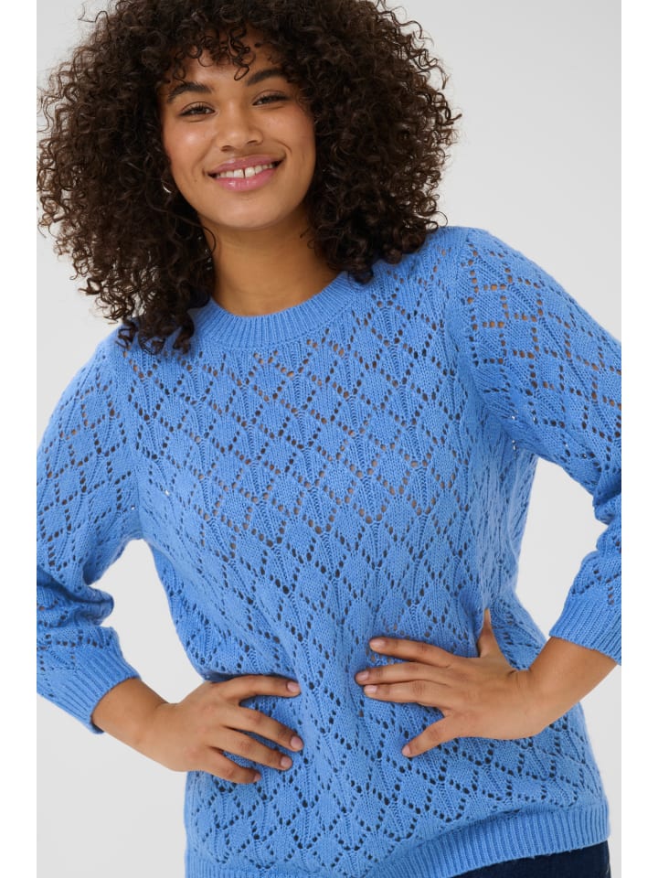Свободный трикотажный свитер с открытым кружевным узором, классическим круглым вырезом и рукавами длиной 3/4. Универсальные сочетания для комфорта и стиля.
