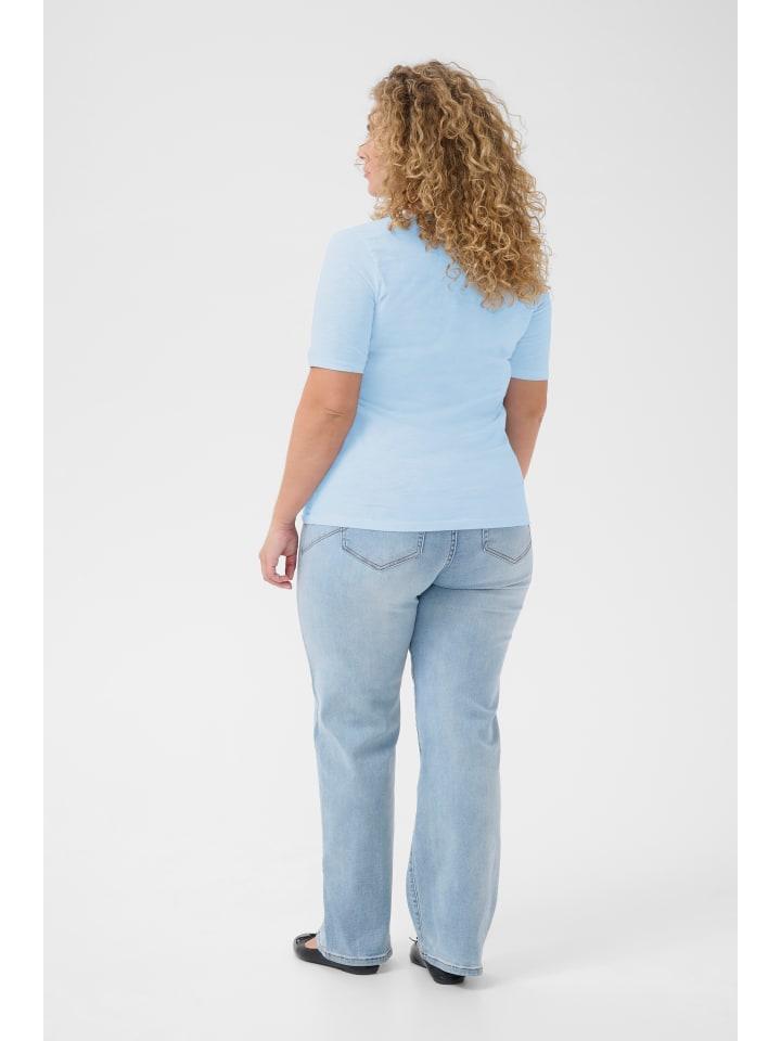 Удобная трикотажная рубашка свободного кроя с тонким кружевом на V-образном вырезе. Короткие рукава обеспечивают гибкость для повседневной носки и различных сочетаний.