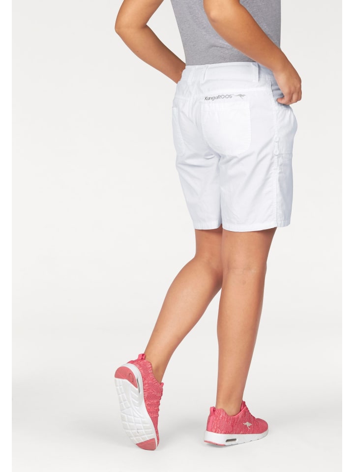 Можно подвернуть как шорты или носить чуть длиннее. Застегивается на планку. Два передних кармана с небольшими сборками, два накладных кармана сзади. Небольшой вышитый логотип над карманом. Удобные в носке.