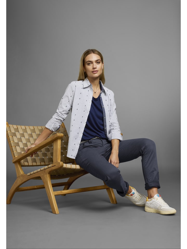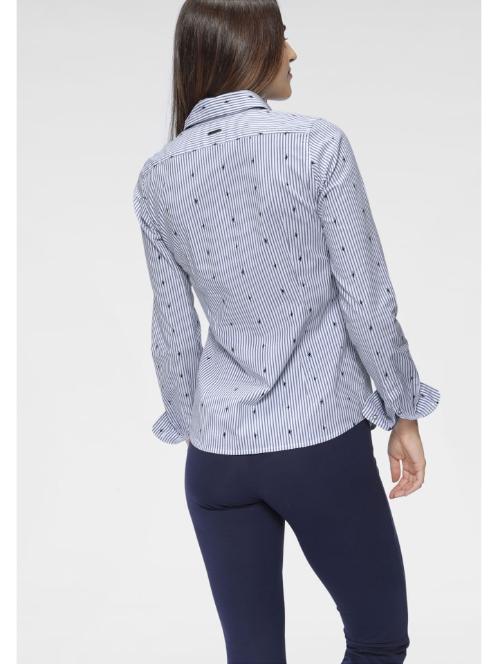 Простая женская блузка-рубашка от KangaROOS с контрастными деталями. Облегающий крой, закрывающий бедра. Длинные рукава. Верх изделия легко ухаживать благодаря прочной ткани.