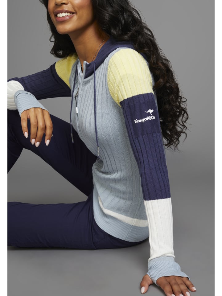 Этот кардиган с капюшоном от KangaROOS с эффектными цветовыми блоками - уютный, теплый и в то же время модный. Кардиган облегает бедра и имеет облегающий крой. Ребристые манжеты на длинных рукавах и на торсе. Образ дополняет фирменная этикетка. Кардиган с капюшоном удобен в носке благодаря мягкому хлопку. Он дополнит классический образ для офиса или уютного отдыха на диване.
