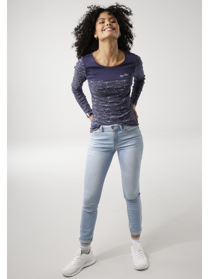 Универсальная женская рубашка с длинным рукавом от KangaROOS. Благодаря облегающему крою, закрывающему бедра, она позволяет создавать непринужденные и стильные образы. Верх выполнен из эластичного материала в рубчик, не стесняющего движений, для максимального комфорта.