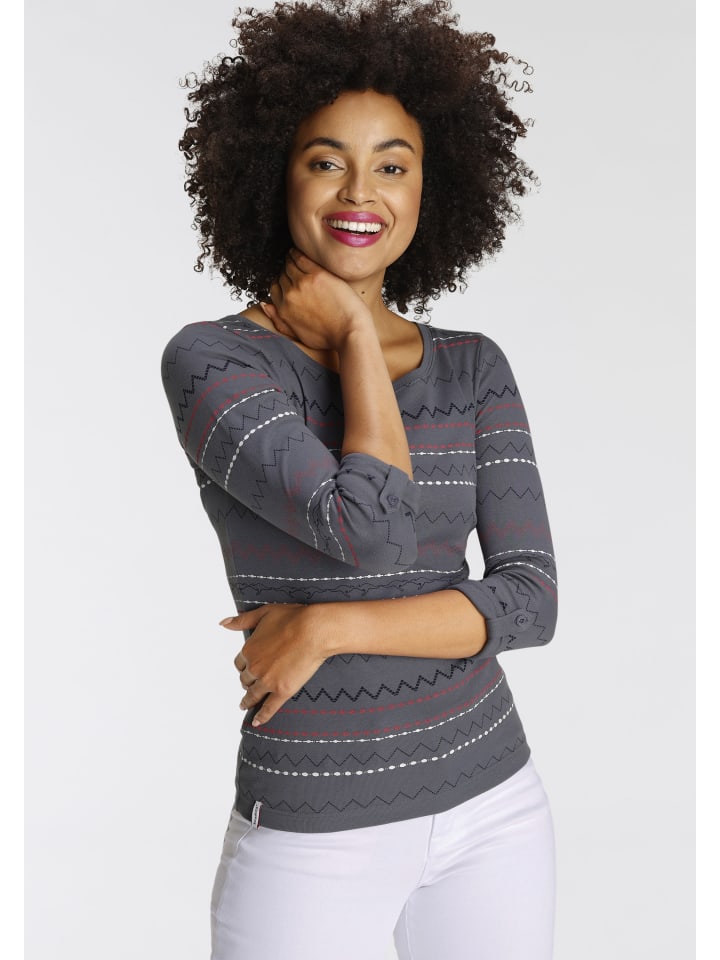 Простая женская рубашка с длинными рукавами от KangaROOS с элегантным зигзагообразным узором. Благодаря облегающему крою, закрывающему бедра, она позволяет создавать модные и универсальные образы. Верх выполнен из эластичного ребристого материала, не стесняющего движений, и обеспечивает высокий комфорт при ношении.
