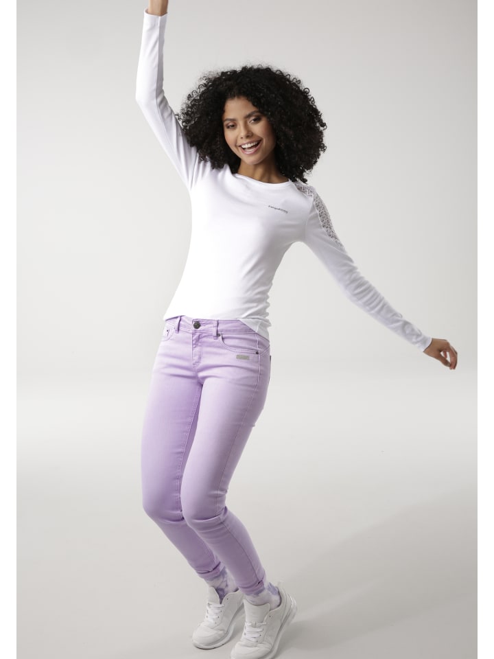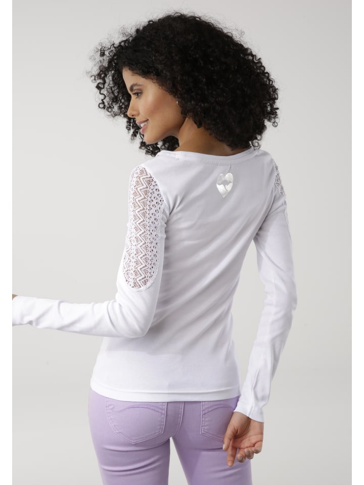 Классическая женская рубашка с длинным рукавом от бренда KangaROOS. Облегающий крой, закрывающий бедра, и декорированный очаровательным кружевом. Высокая эластичность ребристого материала делает верх особенно комфортным.
