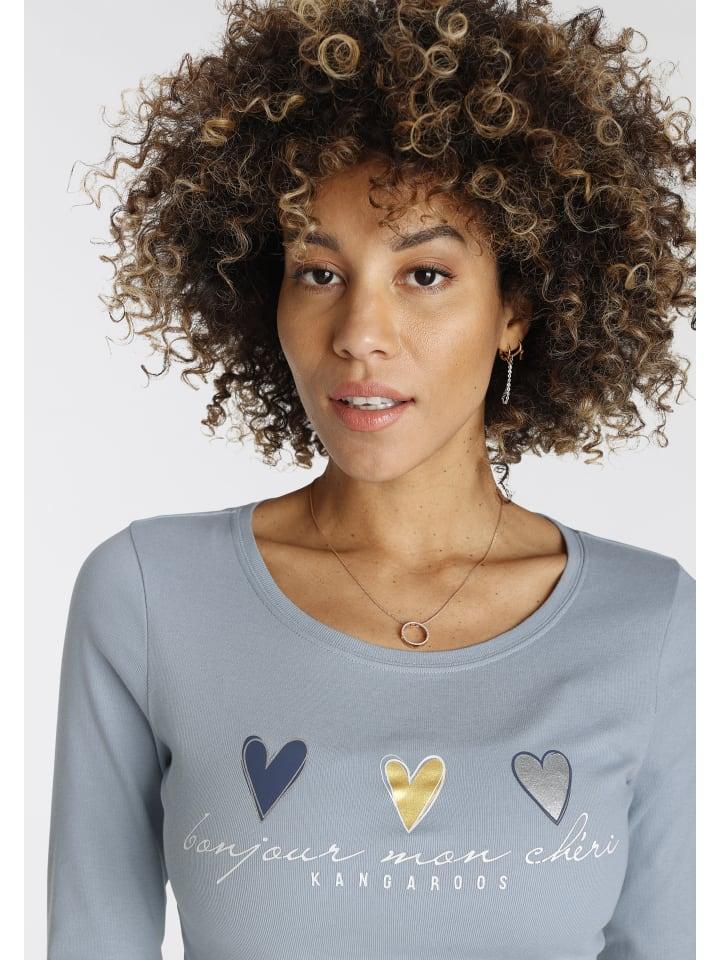 Универсальный женский топ с длинными рукавами от KangaROOS с игривыми сердечками. Он прикрывает бедра и имеет очень облегающий крой. Длинные рукава. Высокая эластичность рубчатого материала делает топ особенно удобным.