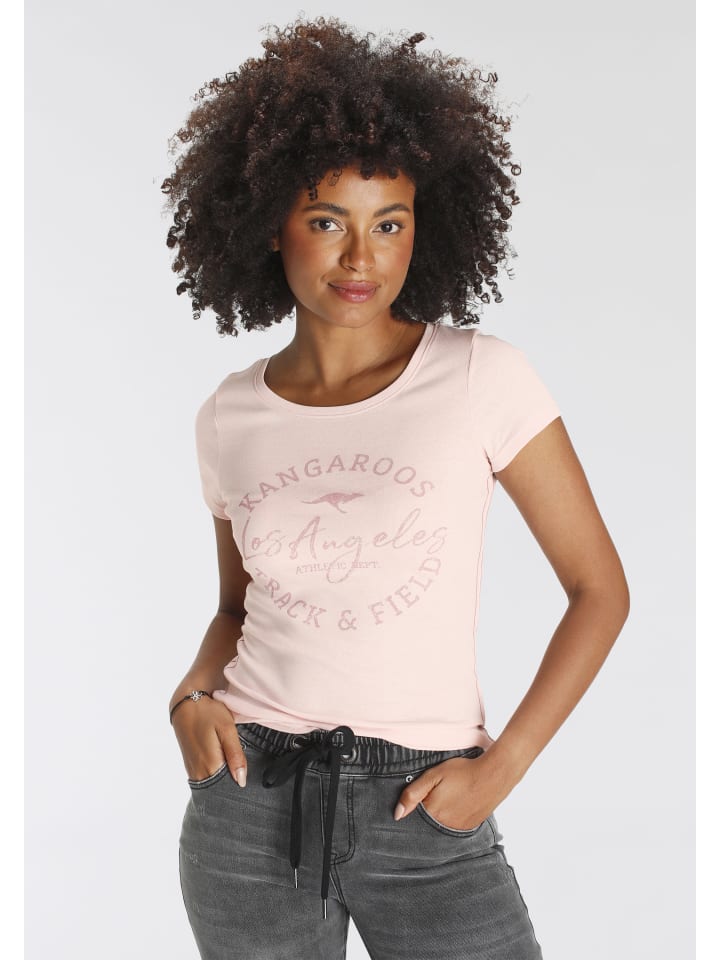 Простая женская рубашка с принтом от KangaROOS. Облегающий крой, закрывающий бедра. Короткие рукава. Благодаря высокой эластичности ребристой ткани, верх адаптируется к форме тела.