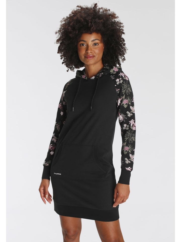 Это платье-свитшот от KangaROOS практически гарантированно станет стильным нарядом, будь то повседневный или элегантный образ. Короткое и подчеркивающее фигуру. Длинные рукава дополнены ребристыми манжетами. Спортивный вид образу придает капюшон на шнурке. Изнаночная сторона платья с начесом создает уют и мягкость.
