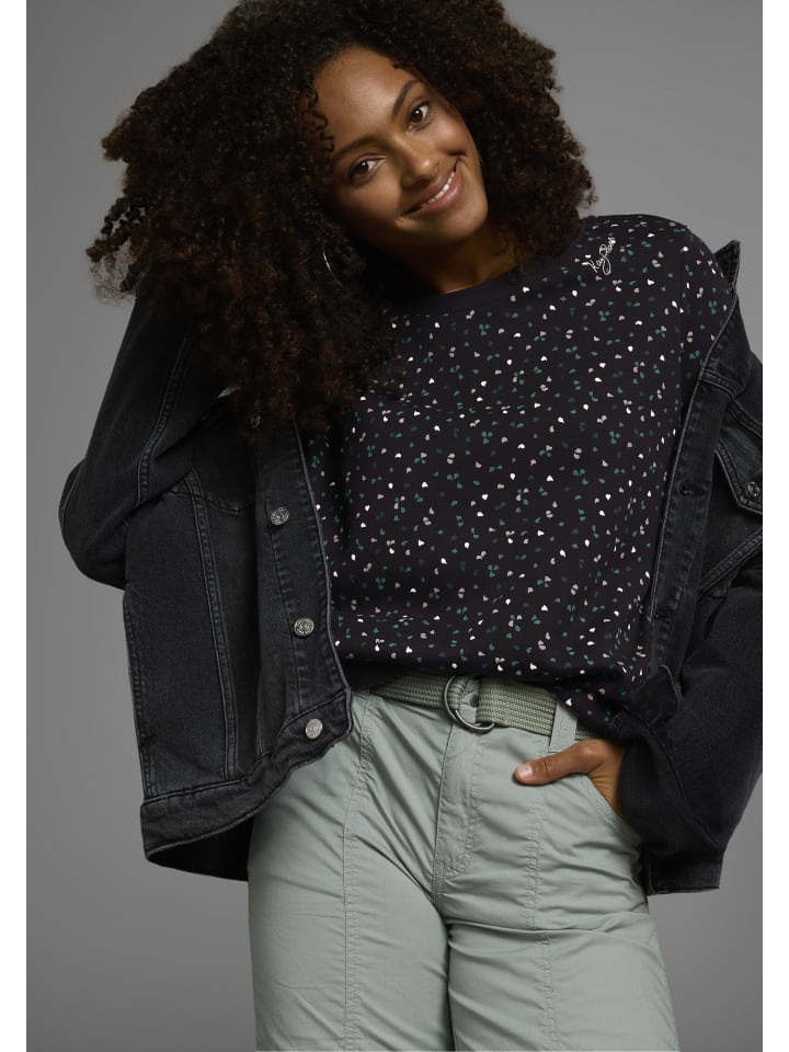 Классическая женская толстовка от бренда KangaROOS с принтом. Облегающий крой, закрывающий бедра. Вырез горловины с манжетами. Длинные рукава. Верх из ткани интерлок прочный и приятный к телу.