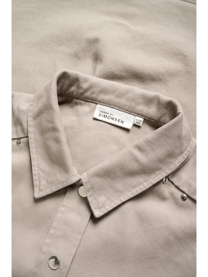 Рубашка свободного кроя со структурированным силуэтом, острым воротником, видимыми кнопками и широкими короткими рукавами. Металлические заклепки акцентируют плечи и подол.