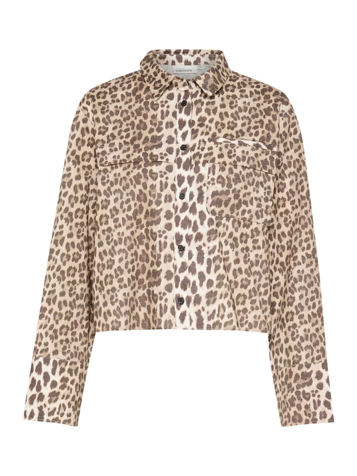 Куртка с леопардовым принтом, прямого, укороченного покроя. Классический рубашечный воротник, планка на пуговицах, двойные нагрудные карманы и длинные рукава.