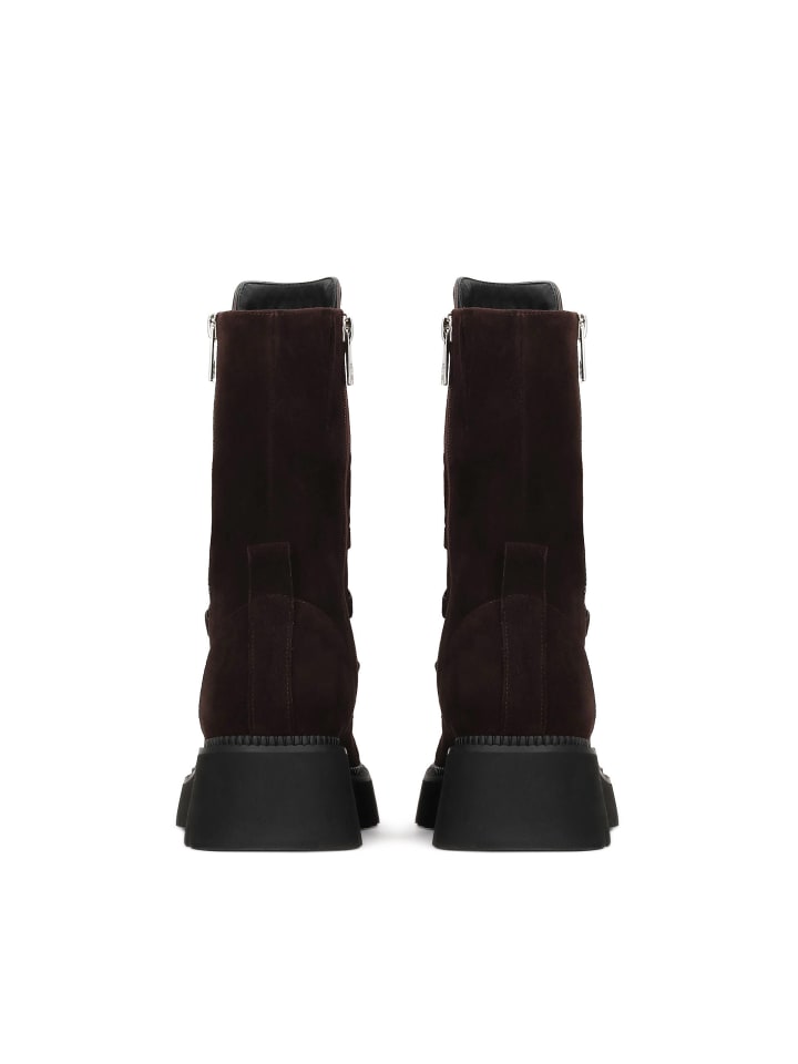 Выразительные ботинки из высококачественной натуральной замши элегантного глубокого коричневого оттенка. Мягкая текстура материала придает обуви утонченный осенне-зимний характер, обеспечивая при этом комфорт и стильный вид на каждый день. Модель установлена на прочную, массивную подошву с выраженным профилем и слегка приподнятым каблуком, что обеспечивает комфорт и устойчивость на различных поверхностях. Голенище доходит до щиколотки и оснащено двумя молниями: функциональная молния внутри обеспечивает комфортную повседневную носку, а декоративная молния снаружи холодного серебристого цвета добавляет дизайнерский штрих. Декоративная широкая шнуровка спереди также привлекает внимание - она выполняет декоративную функцию и подчеркивает уникальный стиль модели.