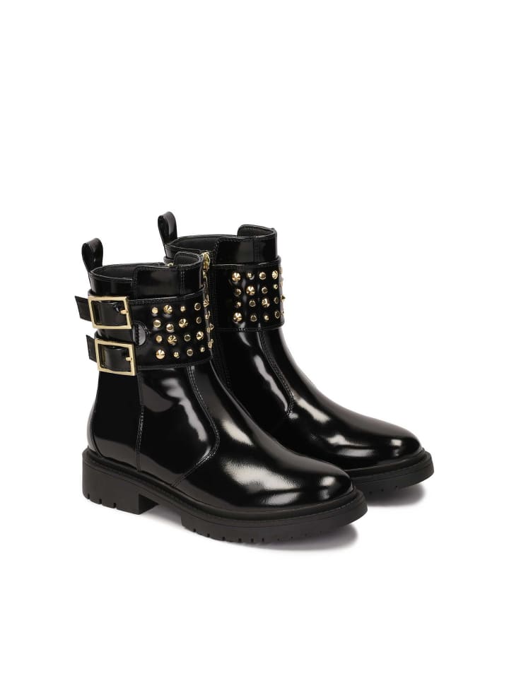Эти черные ботинки на плоской подошве из слегка блестящей натуральной кожи - удобная и стильная обувь, идеально подходящая для повседневной носки. Простой верх делает их универсальными и стильными. Уникальным декоративным элементом является пряжка, инкрустированная золотистыми металлическими стразами. Это украшение не только добавляет индивидуальности, но и создает роскошный, привлекающий внимание акцент. Плоская подошва обеспечивает максимальный комфорт в течение всего дня и делает эти ботинки практичным выбором для тех, кто ценит сочетание стиля и функциональности.