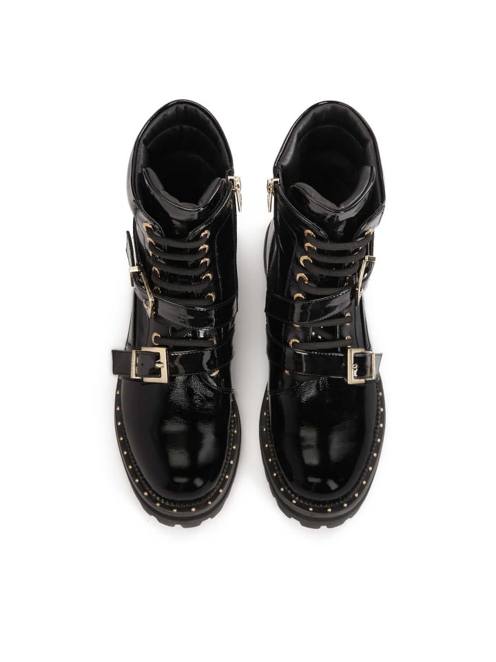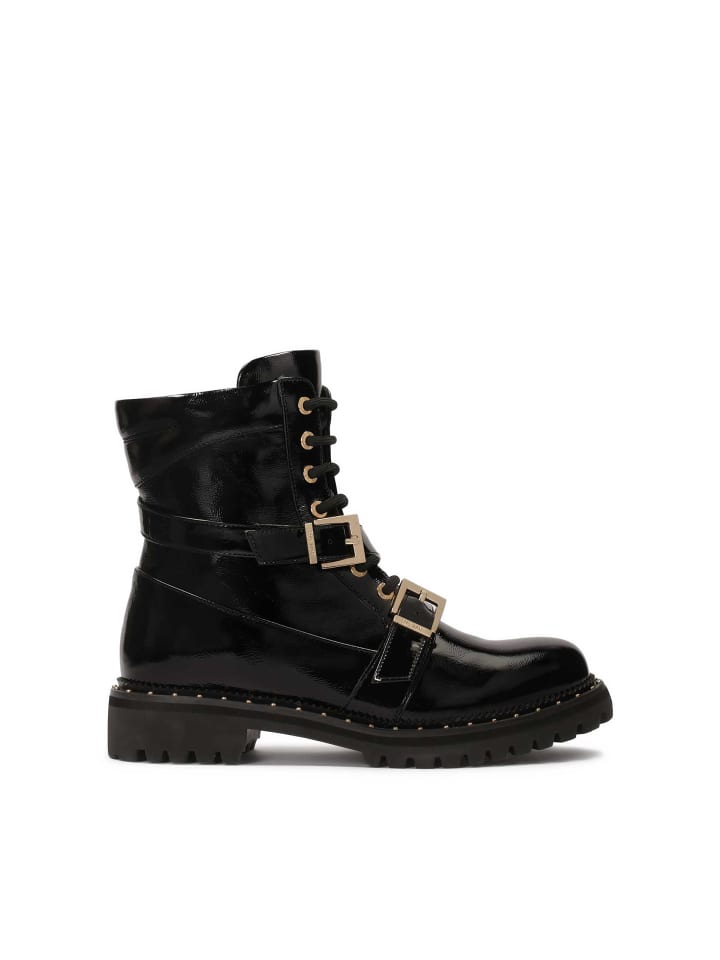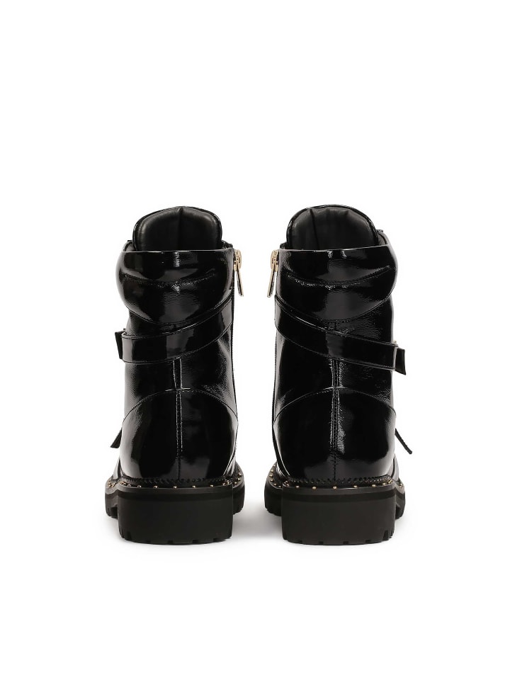 Эти черные ботильоны с голенищем - уникальное сочетание классики и современных деталей. Блестящая лакированная поверхность придает элегантность и изысканность, делая их идеальным выбором для самых разных образов. Голенище длиной до щиколотки украшено ремешками со стильными пряжками, которые служат привлекательным декоративным элементом. Они расположены так, чтобы подчеркнуть динамичный силуэт обуви. Подошва обеспечивает хорошее сцепление, что особенно важно осенью и зимой. Эти ботинки идеально дополнят модный городской образ. Мягкая подкладка из овчины гарантирует высокий уровень комфорта, а тканевая меховая подкладка согреет в холодные дни.