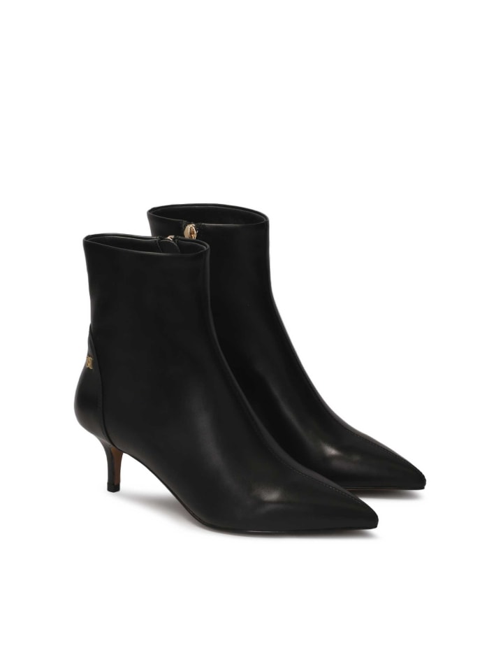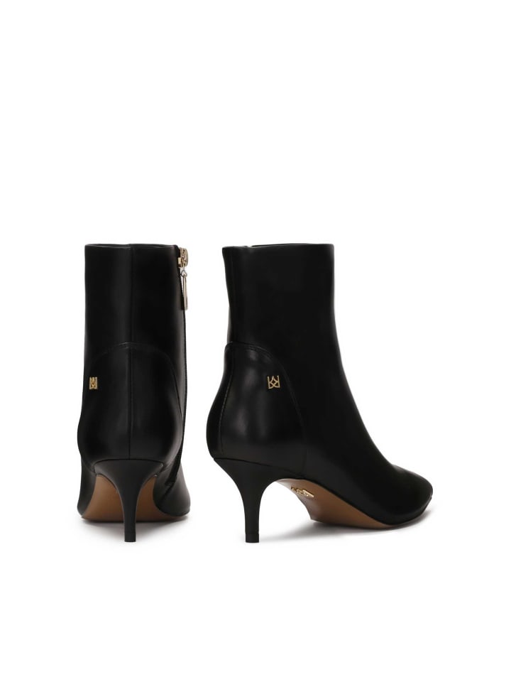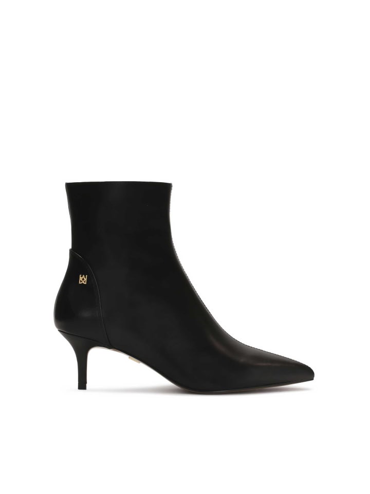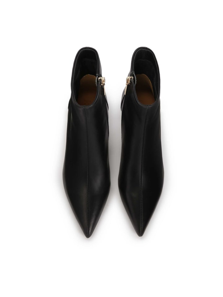 Эти черные минималистичные ботинки из натуральной кожи придают им элегантный и вневременный вид. Они оснащены низким и прочным каблуком-утконосом, который обеспечивает удобную посадку и идеально подходит для длительного ношения. Отличительной чертой этих ботинок является удлиненный, заостренный носок, который придает им современный, слегка авангардный вид. Ботинки также оснащены молнией для удобства надевания и снимания. Их простой, но стильный дизайн делает их отличным выбором для самых разных образов.