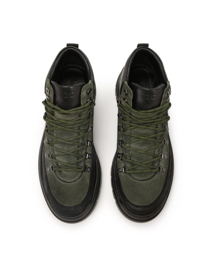 Современные треккинговые ботинки, изготовленные из комбинации замши цвета хаки и черной кожи. Контрастное сочетание цветов придает обуви эффектный и динамичный вид, идеально подходящий как для повседневной носки, так и для активного отдыха. Модель установлена на прочной рифленой подошве с выраженным профилем, обеспечивающей надежное сцепление и комфорт даже в сложных условиях. Верхняя часть дополнена мягким черным воротником с мягкой подкладкой для дополнительного комфорта в области щиколотки. Система шнуровки с металлическими люверсами и крючками подчеркивает аутдор-характер обуви и обеспечивает надежную посадку. Отличный выбор для мужчин, которые ценят функциональность, комфорт и современный дизайн - как для городского стиля, так и для активного отдыха.