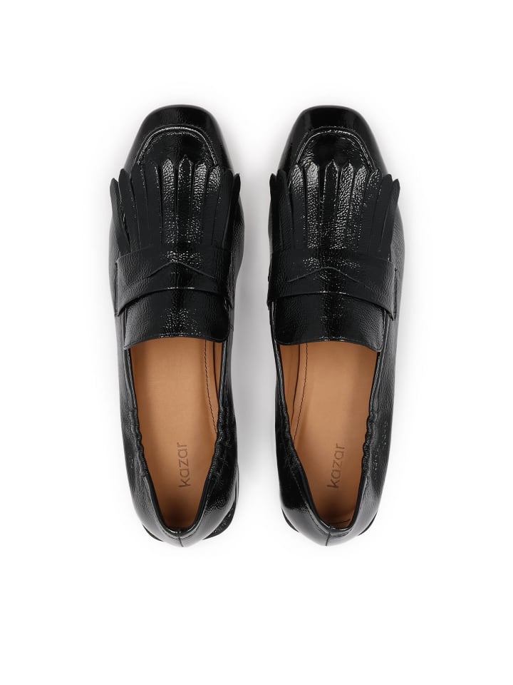 Эти тапочки, полные шика и оригинальности, поражают своим неповторимым дизайном и яркими деталями. Изготовленные из высококачественной лакированной кожи, они выделяются легким блеском и характерной складкой, которая придает им уникальную текстуру и глубину. Тонкое, элегантное голенище украшено широким ремешком, который подчеркивает классический характер модели, а кожаные кисточки добавляют динамичности и художественной выразительности. Это сочетание классической эстетики с современным оттенком, идеально подходящее женщинам, которые ценят сдержанные детали. Крой slip-on обеспечивает комфорт и идеальную посадку, делая эти туфли отличным выбором на каждый день. Черная лакированная кожа обеспечивает универсальность - они подойдут как к нарядным, так и к повседневным образам, добавив изысканности. Мягкая подкладка из полуанилиновой овчины гарантирует исключительный комфорт. Подошва из тунисской кожи отличается долговечностью и эстетической привлекательностью.