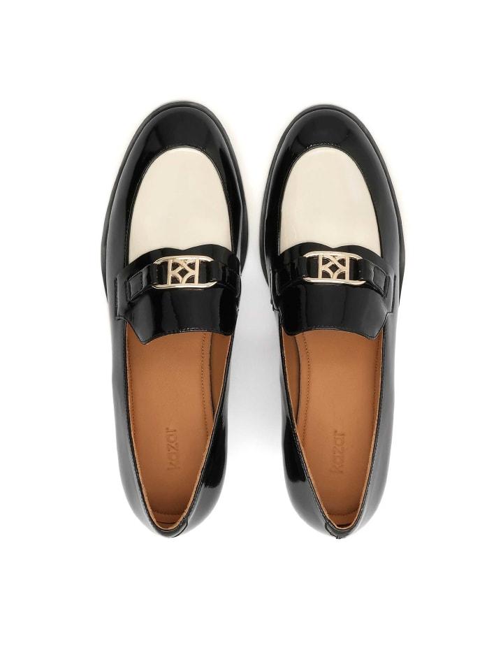 Лакированные лоферы - элегантный выбор для тех, кто ценит классический стиль в современном исполнении. Эта модель отличается эффектным цветовым сочетанием: глубокий черный цвет кожи гармонично контрастирует с кремовой вставкой, придавая обуви уникальный, изысканный характер. Отличительным элементом этой модели является декоративная полоска с металлической монограммой, которая тонко подчеркивает эксклюзивный дизайн обуви. Конструкция слип-он обеспечивает легкое скольжение, а широкий низкий каблук гарантирует устойчивость и комфорт в течение всего дня. Эта модель вне времени подойдет как для делового, так и для повседневного стиля. Она прекрасно сочетается с элегантными брюками, костюмами и классическими платьями, добавляя им утонченной элегантности и современного шика. Подкладка из мягкой полуанилиновой овчины обеспечивает высокий комфорт при носке.