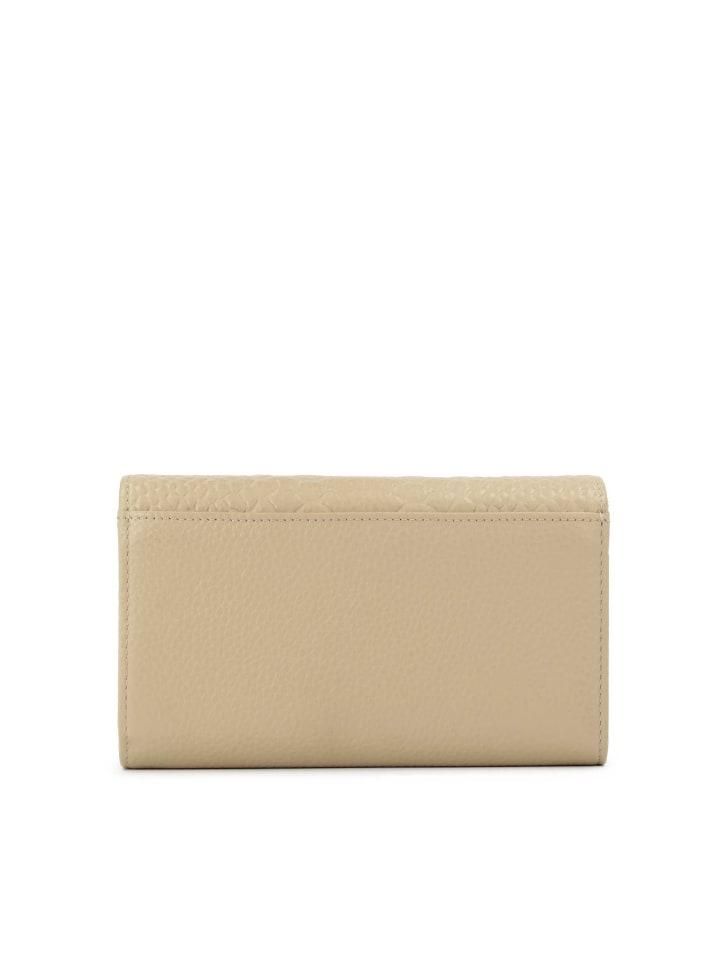 Бежевый кошелек - элегантный и изысканный аксессуар, сочетающий в себе сдержанный дизайн и уникальные детали. Изготовленный из высококачественной натуральной кожи, он отличается мягким, естественным оттенком, что делает его идеальным выбором для тех, кто ценит классику и универсальность. Клапан кошелька украшен тисненым экзотическим узором, который придает ему уникальный и привлекательный вид, а также элегантным золотым логотипом. Компактный размер кошелька сочетает в себе практичность и функциональность: в нем есть отделения для карт, купюр и монет, что делает его не только эстетичным, но и практичным для повседневного использования.