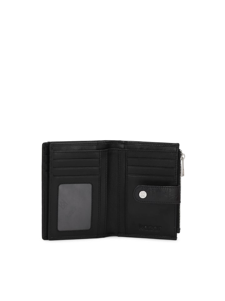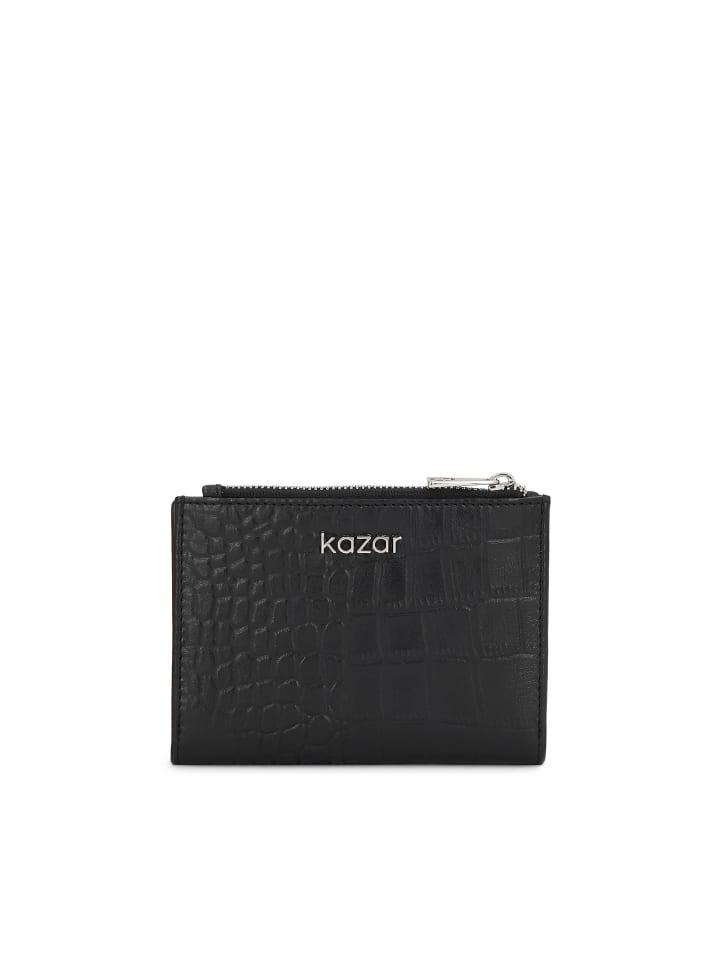 Уникальный кошелек классического черного цвета из высококачественной натуральной кожи с тиснением, имитирующим кожу крокодила. Элегантный и практичный дизайн сочетает в себе роскошный внешний вид и повседневную функциональность. Декоративная застежка-кнопка с металлическим логотипом KAZAR на лицевой стороне подчеркивает его престижный характер. Внутреннее пространство кошелька продумано до мелочей: множество отделений для карт, отделение с окошком для документов, отделение для купюр и карман для монет на молнии с двумя отделениями. Благодаря компактной форме он легко помещается в дамскую сумочку, сохраняя при этом всю свою функциональность.