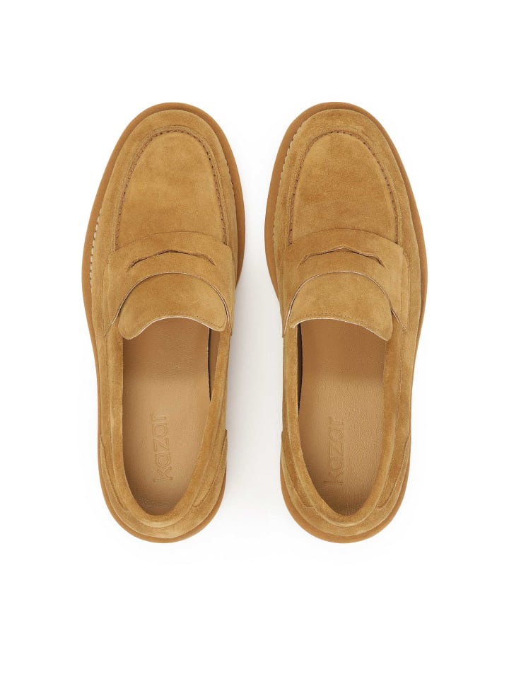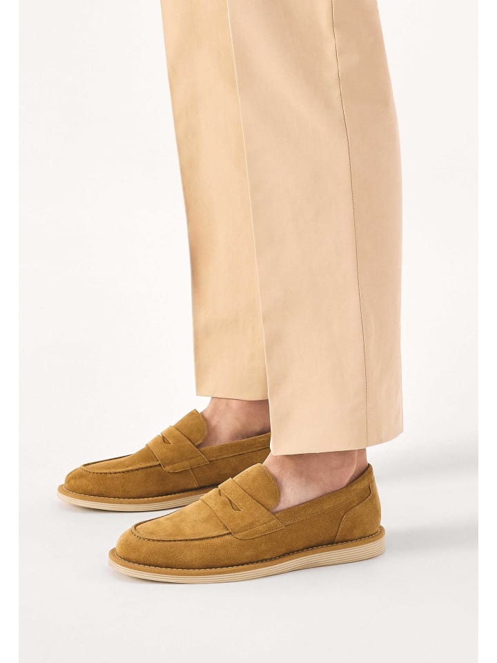 Эти мужские лоферы из светло-коричневой замши отличаются простым, но элегантным дизайном. Мягкий на ощупь кожаный верх с тонкой текстурой придает обуви роскошный вид. Обувь без шнурков легко надевать и снимать. Контрастная светлая подошва проста и минималистична, что делает ее идеальным вариантом для повседневного образа. Внутренняя отделка из овчины гарантирует гигиеничность и высокий комфорт.