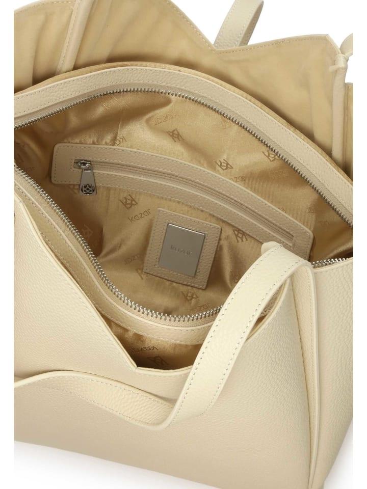 Эта кремовая сумка-шоппер из высококачественной натуральной кожи - элегантный и функциональный выбор для тех, кто ценит стиль и вместительность. Сумка имеет просторное основное отделение, идеально подходящее для повседневных покупок или поездок на работу, а также особую деталь: съемный карман на молнии. Это отделение легко вмещает мелкие предметы, такие как ключи, телефон или кошелек, и обеспечивает дополнительную защиту для самых ценных вещей. Ручки сумки украшены оригинальной строчкой, что придает ей неповторимый характер и делает ее удобной для переноски. Декоративным акцентом служит ремешок с монограммой KAZAR, который подчеркивает изысканный стиль сумки. Эта кремовая сумка-шоппер - идеальный выбор для любого случая, сочетающий в себе минималистичную элегантность и функциональный дизайн.