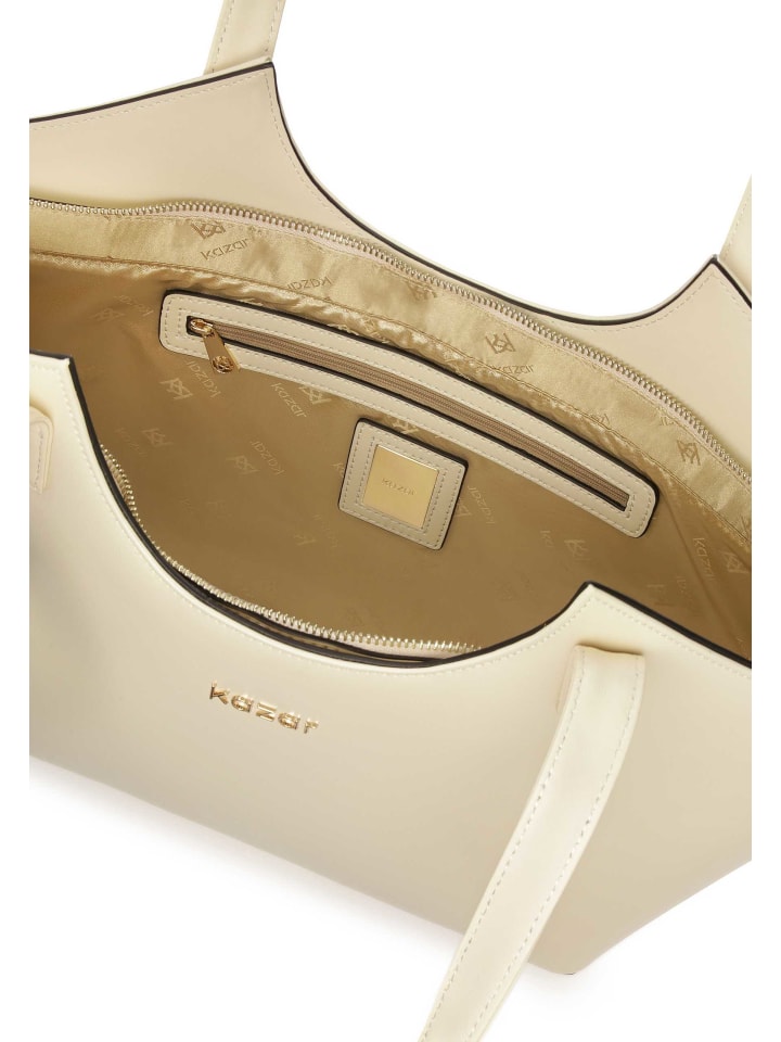 Большая сумка через плечо из гладкой натуральной кожи кремового цвета является воплощением современной элегантности и функциональности. Сумка имеет геометрическую форму, которая придает ей отличительный и современный характер. Благодаря своему размеру и прочной конструкции она чрезвычайно практична и предлагает достаточно места для всех ваших необходимых вещей, не теряя при этом своего элегантного вида. Сумка имеет длинные удобные плечевые ремни, которые позволяют с комфортом носить ее в течение всего дня. Ее минималистичный дизайн, лишенный ненужных украшений, подчеркивает высокое качество материала и точное мастерство изготовления. Гладкая поверхность кожи придает сумке роскошный вид, а яркая цветовая гамма позволяет легко сочетать ее с различными стилями, как официальными, так и повседневными.