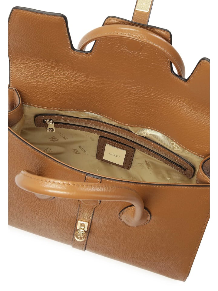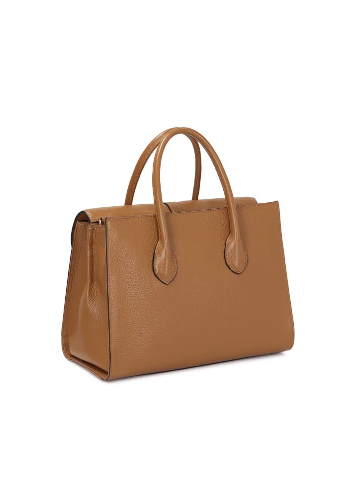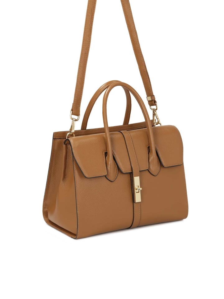 Эта элегантная сумка из натуральной кожи светло-коричневого цвета излучает класс и изысканный стиль. Ее жесткая, правильная форма и прочное, укрепленное основание гарантируют как долговечность, так и функциональность, способствуя общей гармонии. Изящный, слегка очерченный клапан привлекает внимание своей оригинальной формой, а декоративная застежка выполняет как практическую, так и декоративную функцию, придавая сумке уникальный характер. Две прочные ручки из того же материала обеспечивают удобную переноску и идеально дополняют элегантный дизайн. Тщательное мастерство и высококачественная кожа делают эту сумку отличным выбором для официальных мероприятий и повседневных выходов, подчеркивая шик и хороший вкус ее обладательницы.