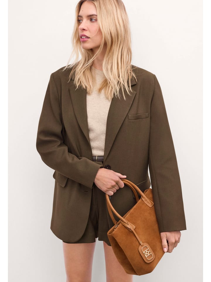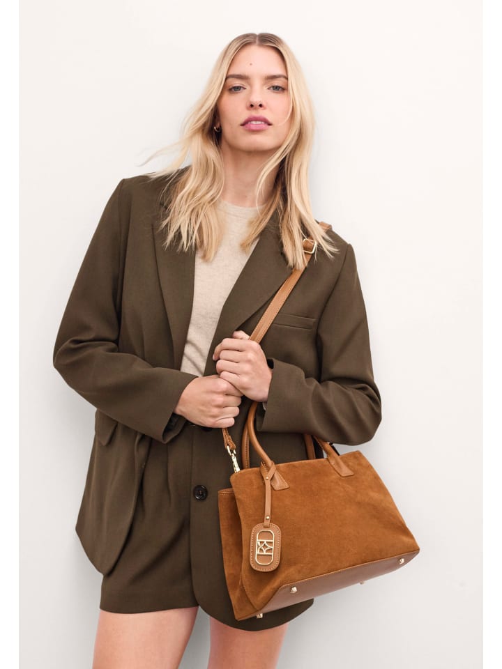 Стильная и вневременная сумка из сочетания мягкой замши и гладкой натуральной кожи теплого светло-коричневого оттенка. Изящная отделка и искусная ручная работа подчеркивают роскошный характер модели, а широкое мягкое дно гарантирует удобство и устойчивость. Модель оснащена двумя прочными ручками для переноски в руках и практичным съемным регулируемым ремнем, позволяющим носить сумку на плече или через плечо. Дополнительным украшением служит элегантный брелок на кожаном ремешке с металлическими деталями - он полностью съемный, что позволяет вам персонализировать свой стиль. Отличный выбор для женщин, которые ценят универсальные аксессуары в классическом дизайне - идеально подходит для работы и общественных мероприятий.