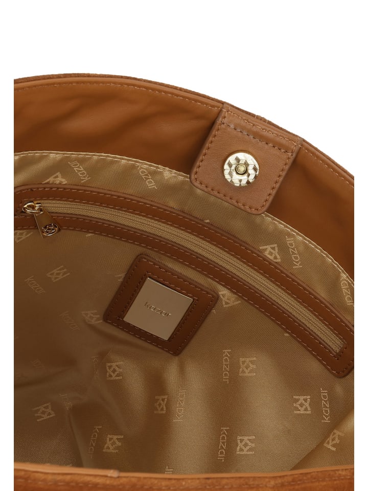 Эта светло-коричневая сумка - воплощение естественной элегантности и вневременного стиля. Изготовленная из мягкой замши, она очаровывает своей простой формой и теплой цветовой гаммой, что делает ее идеальным дополнением как к повседневной, так и к повседневной одежде. Минималистичный дизайн дополняется удобной, широкой ручкой из контрастной, гладкой натуральной кожи, которая добавляет современный штрих. Сумка украшена тонким золотым логотипом KAZAR спереди, что добавляет изящный, но в то же время роскошный штрих. Это идеальный выбор для женщин, которые ценят практичные аксессуары в изысканном виде - удобные, вместительные и всегда в тренде.