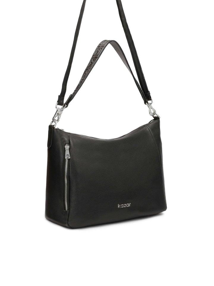 Эта черная сумка свободного кроя идеально подойдет как для повседневных, так и для элегантных образов. Мягкая натуральная кожа премиум-класса придает ей удобный и стильный вид. Сумка оснащена широким съемным плечевым ремнем, украшенным тиснеными монограммами KAZAR, для удобной переноски и стильного образа. Вместительное внутреннее пространство сумки вместит все необходимые вещи, что делает ее одновременно практичной и элегантной. Она идеально подходит для повседневного использования и добавит индивидуальности любому образу.
