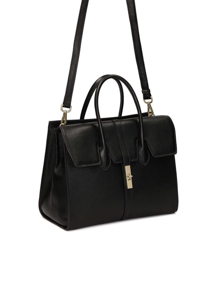 Эта элегантная сумка из натуральной кожи классического черного цвета является свидетельством вневременного шика. Жесткая, правильная форма и прочное, мягкое основание обеспечивают отличную функциональность, подчеркивая профессиональный и изысканный стиль. Изящный клапан уникальной формы придает сумке характер, а декоративная застежка золотистого цвета добавляет роскошный штрих, гармонирующий с глубокой черной кожей. Изысканные золотые детали подчеркивают элегантный дизайн и придают сумке неповторимый блеск. Две прочные ручки, идеально соответствующие пропорциям сумки, обеспечивают удобную переноску и дополняют гармоничный внешний вид. Изготовленная с большим вниманием к деталям, эта сумка подойдет как для официальных случаев, так и для повседневной носки, подчеркивая класс и вкус ее обладательницы.